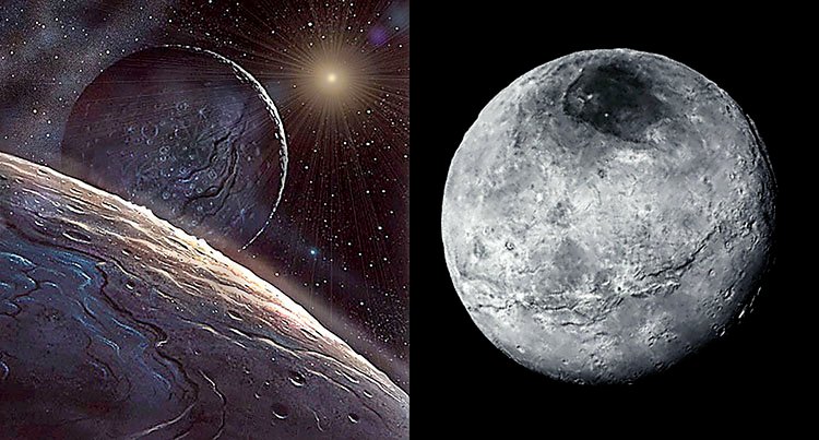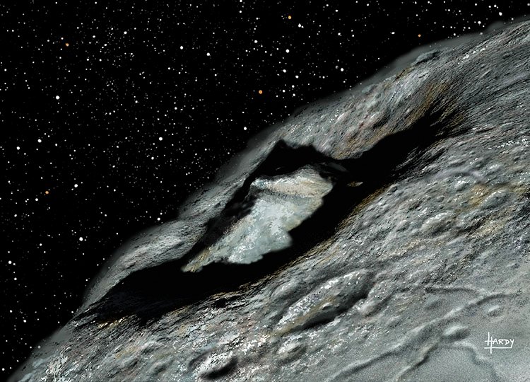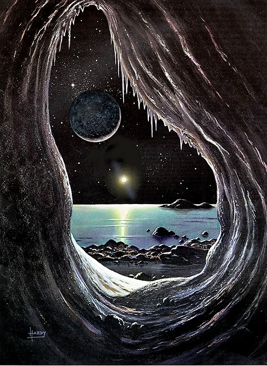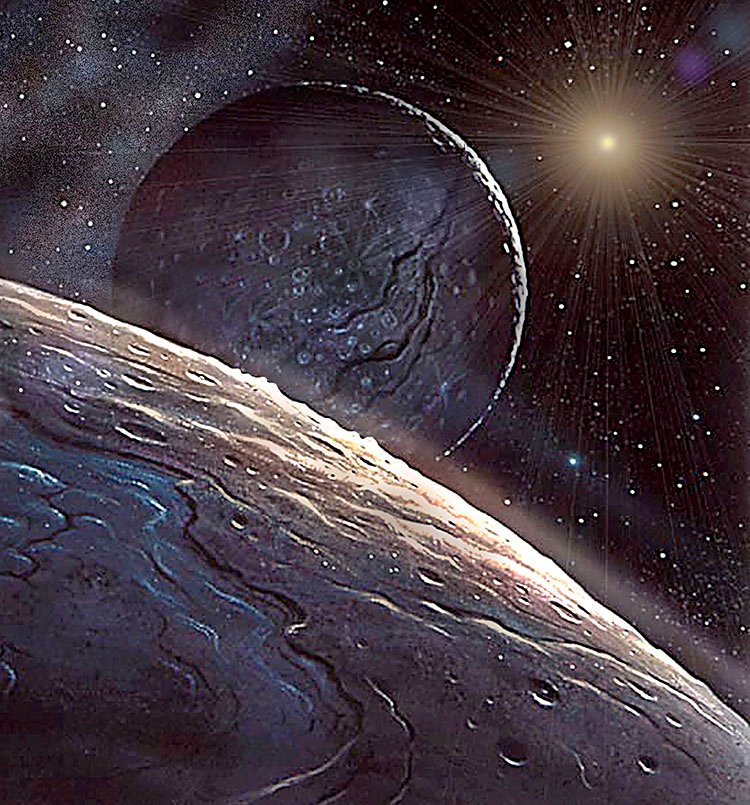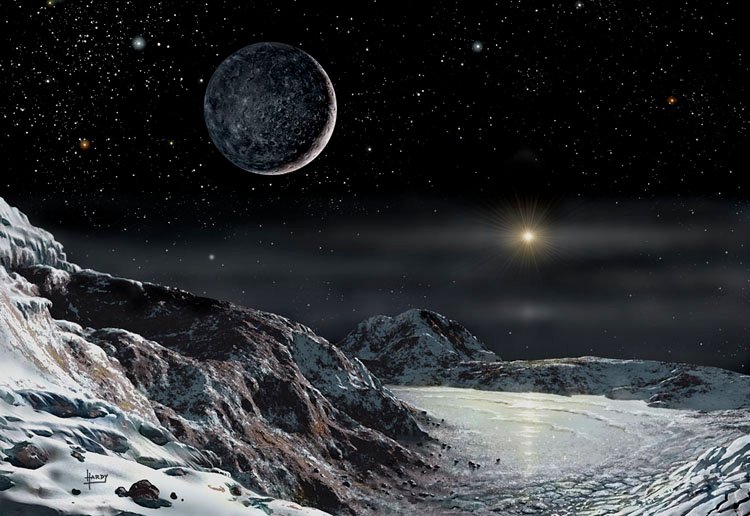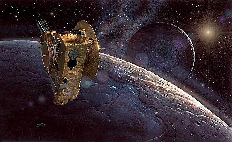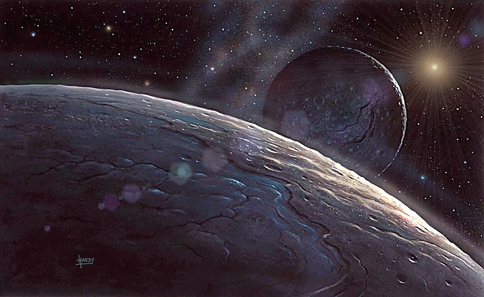 Officially, Pluto is no longer a planet, but a dwarf planet. It was discovered by Clyde Tombaugh at Percival Lowell’s observatory in Flagstaff, Arizona (which Hardy has visited), and for many years was the ‘ninth planet’. It is now demoted to merely a Kuiper Belt object (see Space Debris), but it has a relatively large moon, Charon, and at least 3 smaller ones.